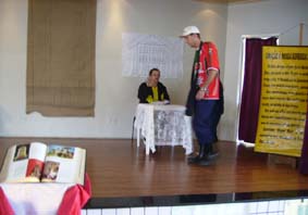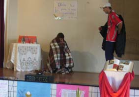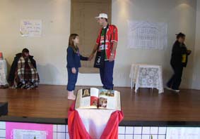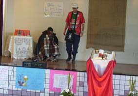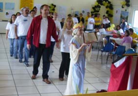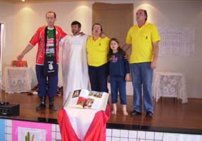 Ap[os a missa, antecipando a gincana, houve a apresentação de uma encenação baseada na música Cidadão, de Zé Geraldo.