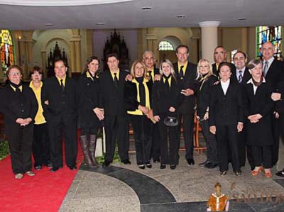 Irmãos e lideranças da paróquia no salão de festas desfrutando de um delicioso
